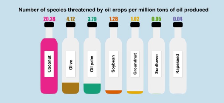 L’huile de coco par exemple est très attractive d’un point de vue consommateur car elle est le reflet d’un produit de qualité. Malgré tout, il faut garder en tête que la production de coco n’est pas sans impact pour l’environnement et la biodiversité. (13) Ces dernières années, la demande en huile de coco a explosé et une étude publiée dans la Current Biology a même suggéré que son impact sur les espèces menacées serait plus important que celui des plantations de palmiers tant décriées. (13) La majorité de la production provient de fermes situées aux Philippines et en Indonésie, deux pays recelant des écosystèmes particulièrement riches et avec un nombre élevé d’espèces rencontrées nulle part ailleurs.