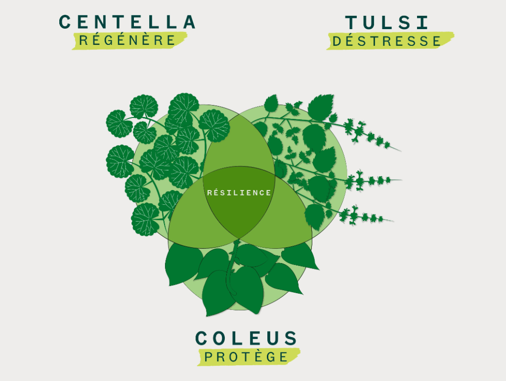 Des recherches de l’équipe d’experts Ulé* résulte un précieux concentré de molécules extrait des trois plantes phares cultivées dans la Ulé Eco Farm. L’équipe a choisi trois plantes renommées pour leur efficacité depuis des millénaires et aux propriétés complémentaires : le Tulsi déstressant, le Coleus protecteur et la Centella régénératrice. Grâce à la ferme verticale, les conditions de culture des plantes sont optimisées et conservent alors toute leur fraîcheur. L’environnement de la ferme permet l’obtention d’un concentré ultra pur.